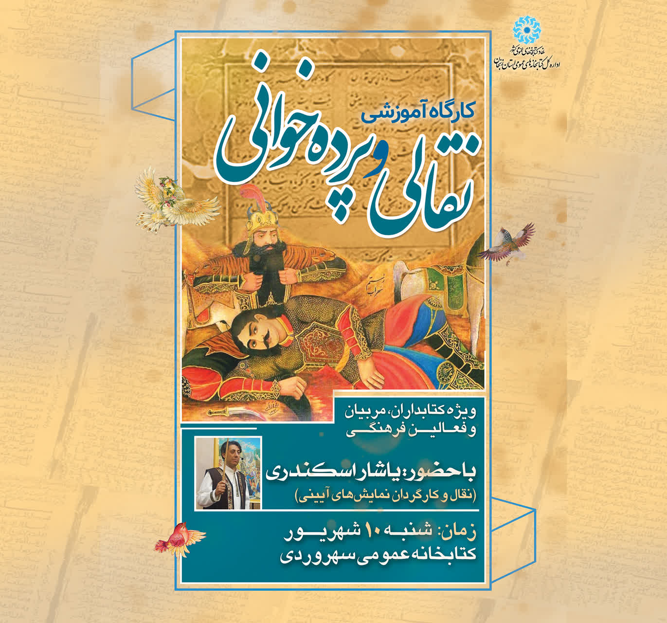 کارگاه آموزش نقالی و پرده‌خوانی با حضور یاشار اسکندری (نقال و کارگردان نمایش‌های آیینی) ویژه کتابداران، مربیان،  معلمان و عموم علاقه‌مندان روز شنبه 10 شهریور ماه در کتابخانه سهروردی زنجان برگزار می‌شود.